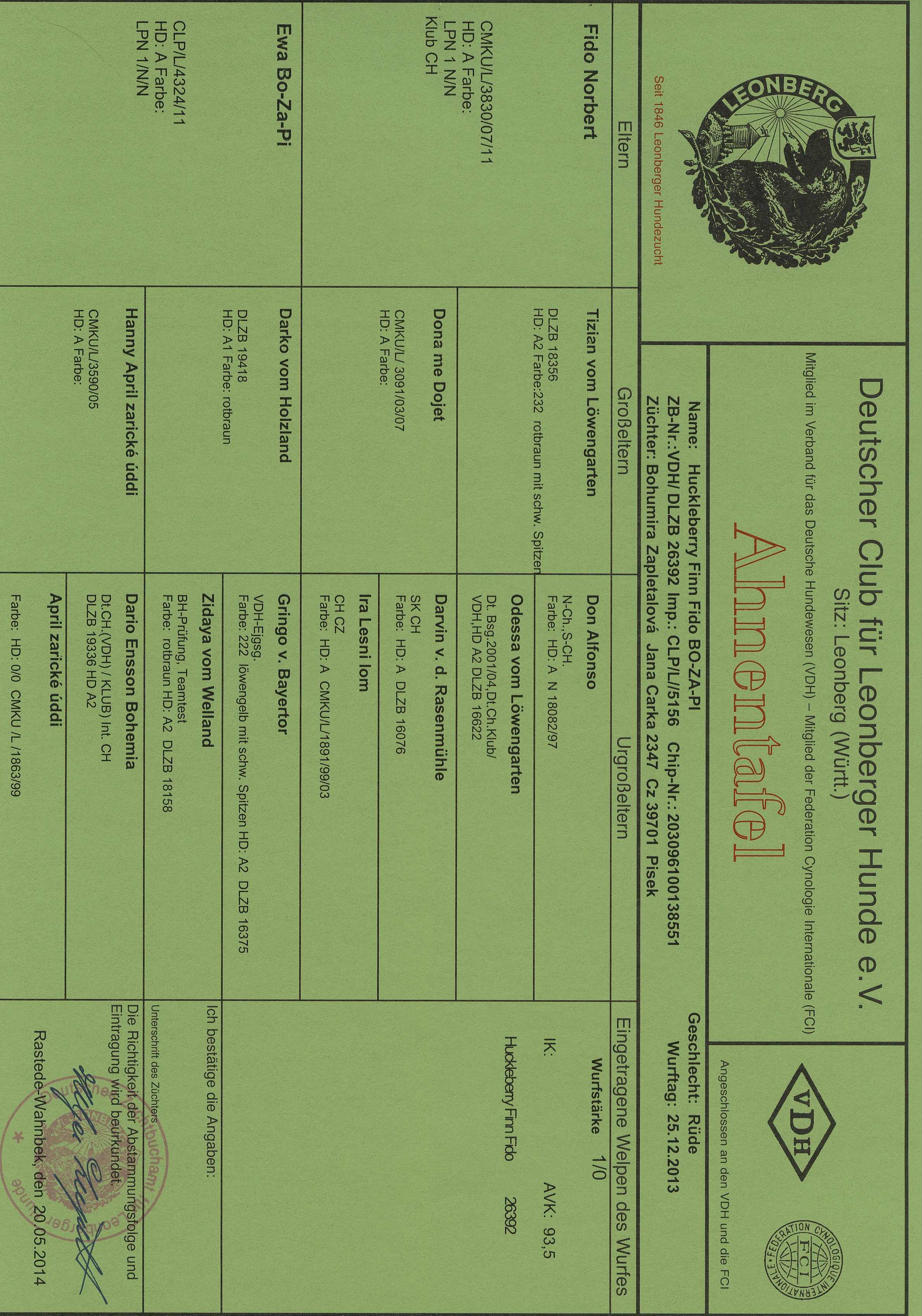 Wurftag: 25.12.2013 Zuchtbuch-Nr. DLZB |